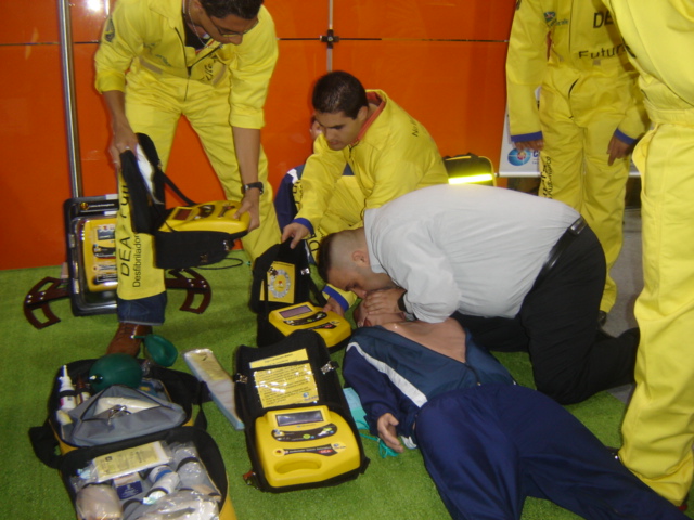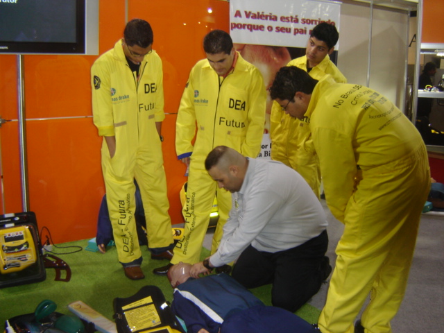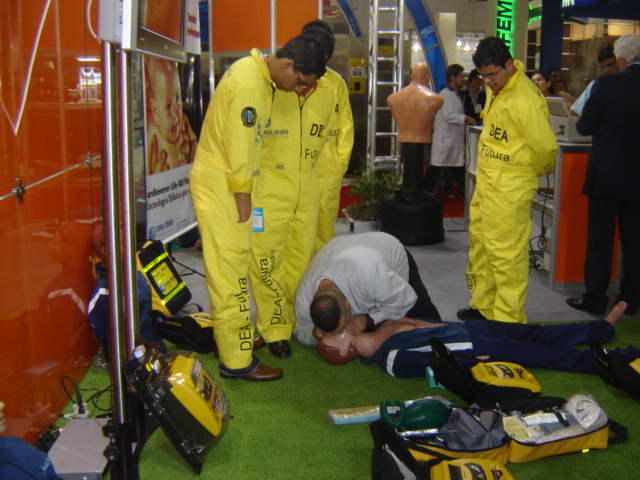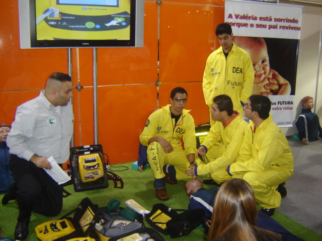 Treinamento em PCR, especializandos do Hospital Santa Cruz-SOBRATI, Prof Thiago Aricó, apresentando DEA, equipe reunida para demonstração ao público com Manequim SIMULACARE Nacional para Massagem Cardíaca Externa